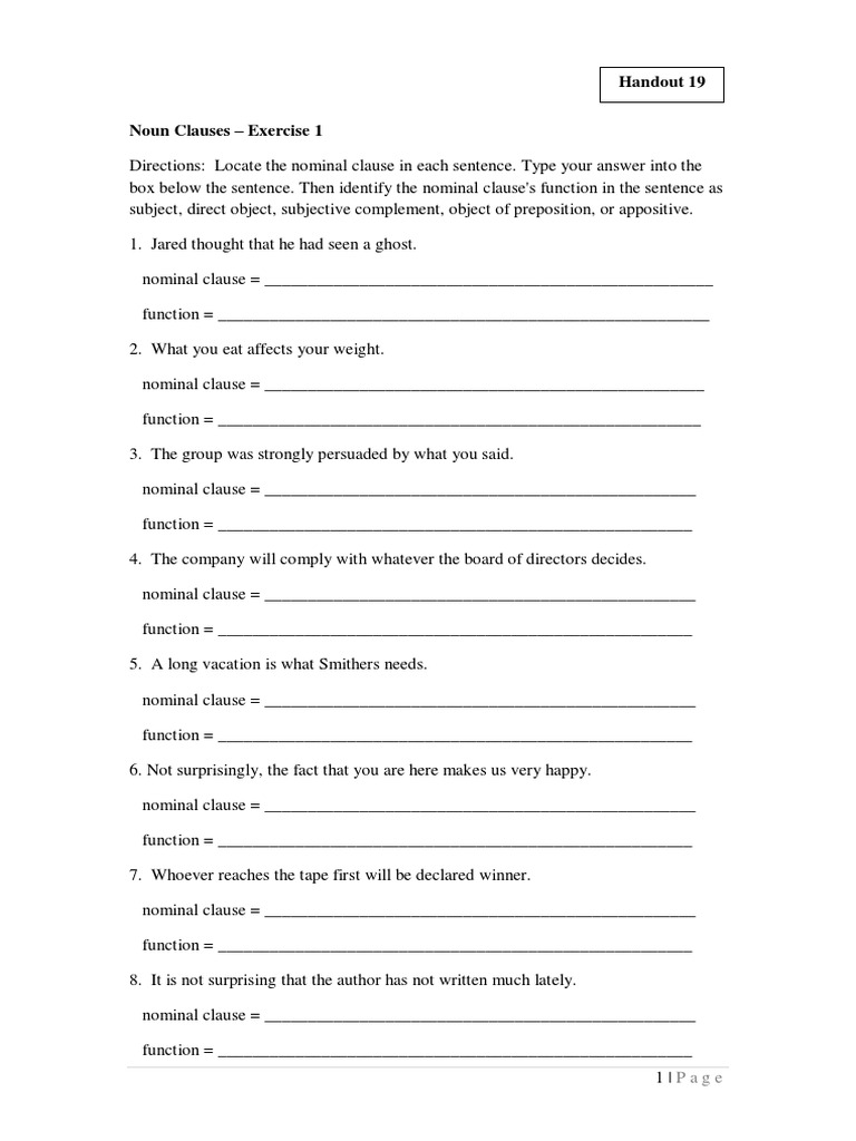 John asked me _.where was his walletwhere his wallet was. Exercise 2 recognizing the use of introductory words. identify each noun clause. Noun clauses exercise 1 identifying noun clauses underline each noun clause in the following документы, похожие на «noun clause exercise». A noun clause is a clause (containing a subject and a verb) that can replace a noun.
